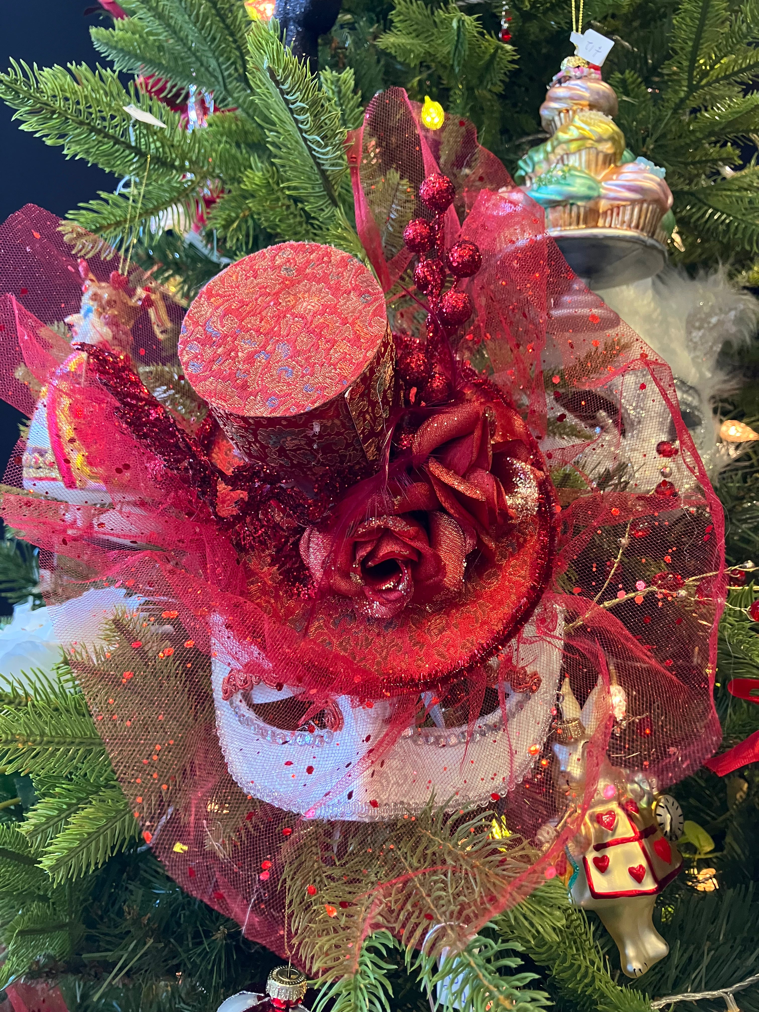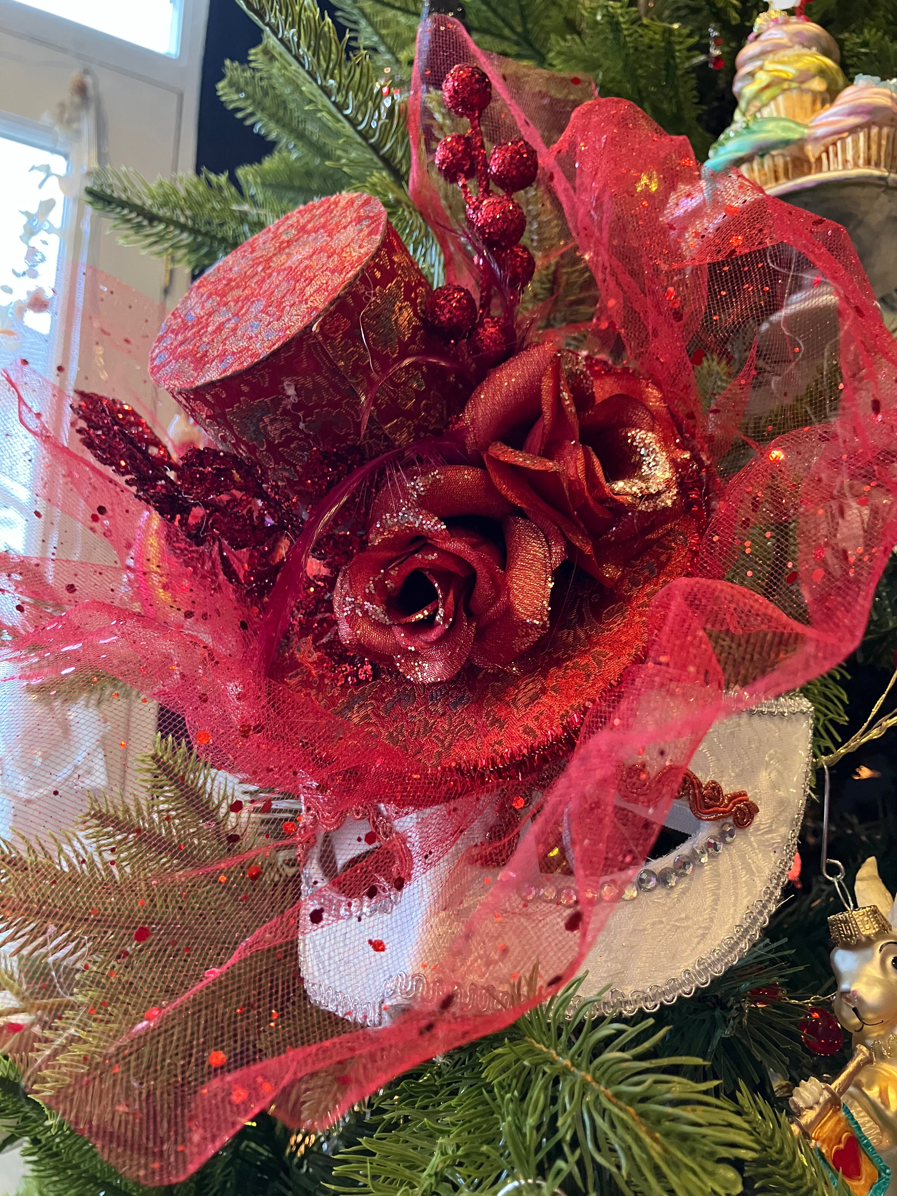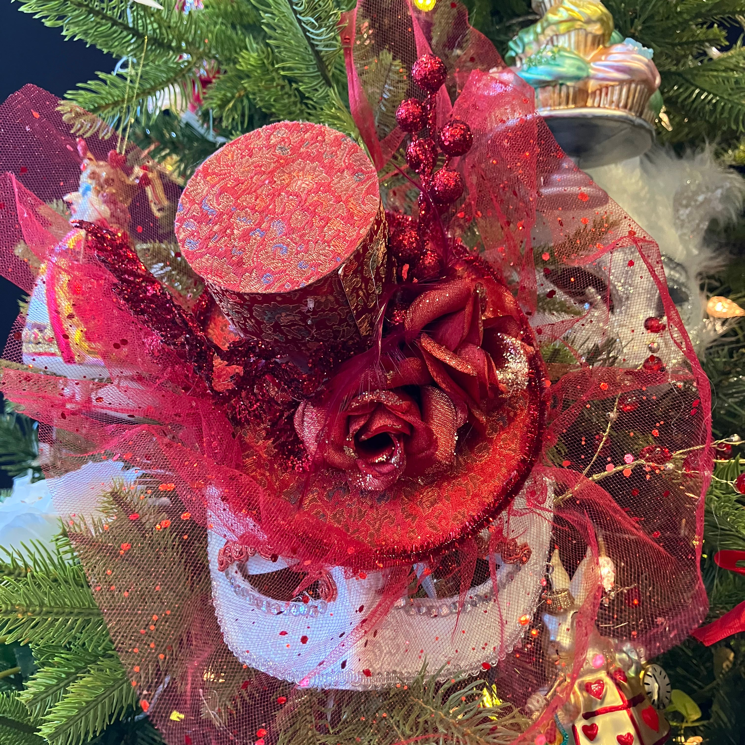 This Red Venetian Fascinator Mask makes a stunning Christmas tree decoration. Crafted from intricately detailed red Venetian fabric, its intricate detailing and sumptuous colour make it a luxurious addition to the home. Perfect for adding a touch of elegance to any Christmas tree.