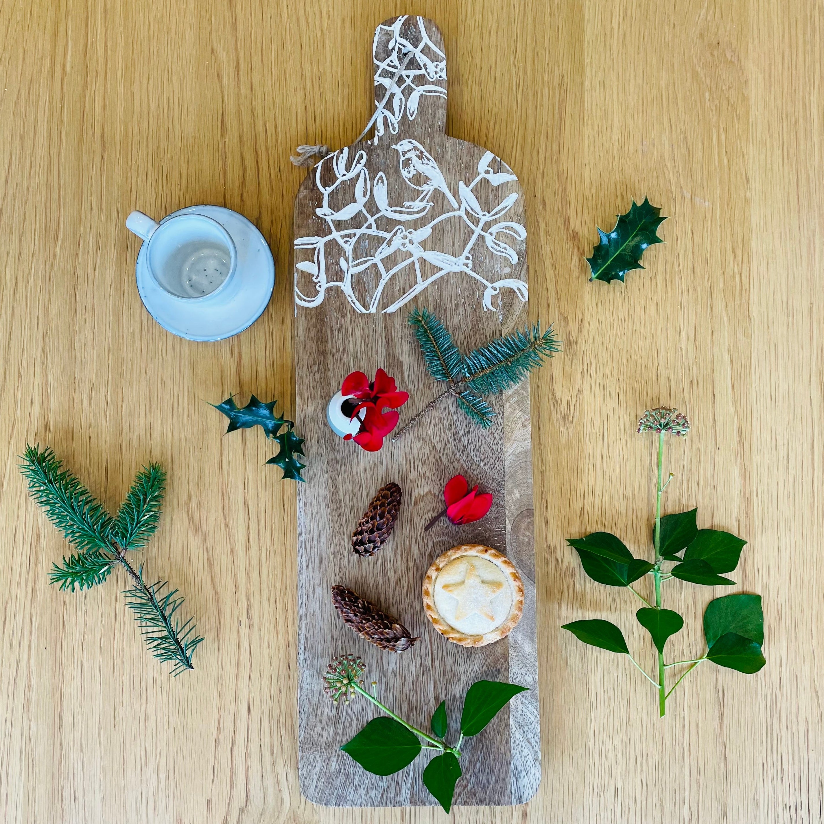 The Robin and Mistletoe Serving Board is made from quality wood and features a robin and mistletoe design. Ideal for serving appetizers or desserts, it adds a simple festive touch to your table.