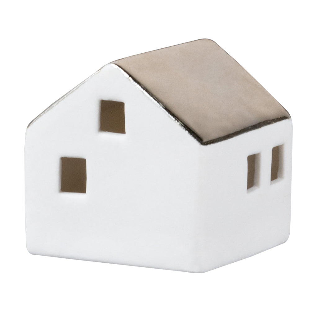 Charming and contemporary, this petite ceramic house glows softly from within, creating a warm and inviting atmosphere. Finished with a sleek metallic roof that catches the light beautifully, its clean lines and simple form bring modern elegance to any space.
