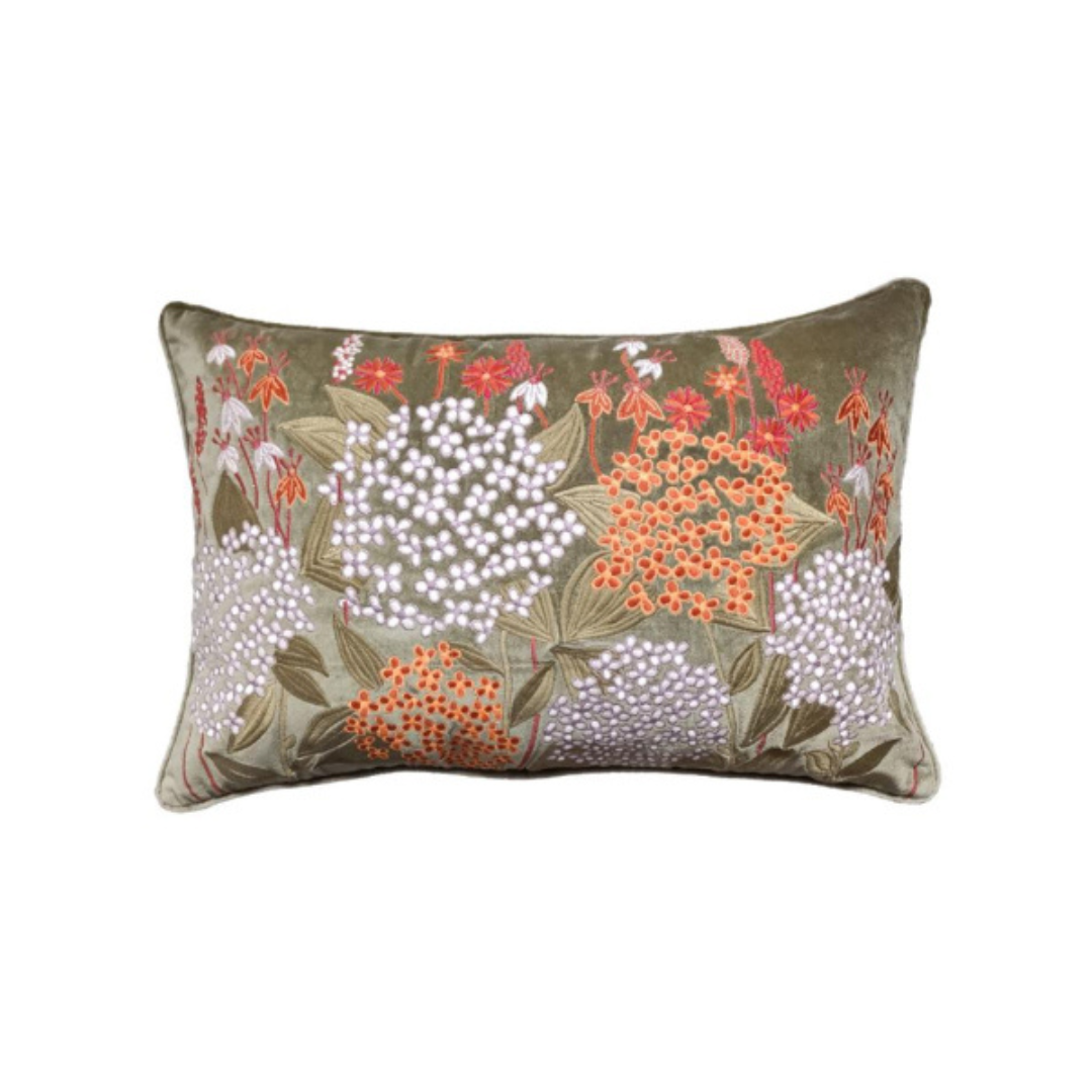 Elevate your décor with this shrubbery embroidered cushion in bayleaf. A refined accent that brings natural sophistication to any room. Draped in sumptuous bayleaf velvet, this cushion features intricate embroidered embellishments that create visual interest with understated grace.