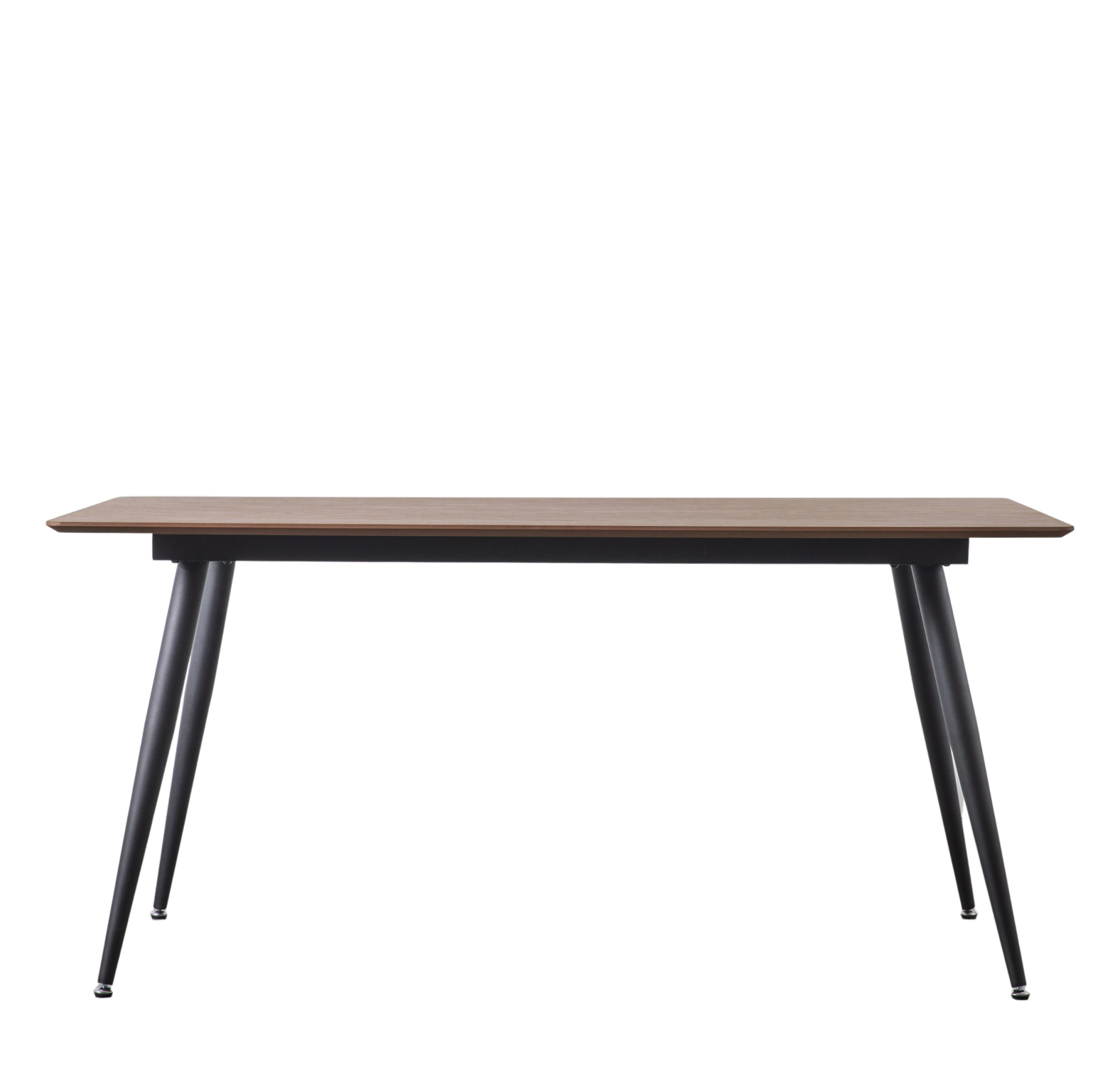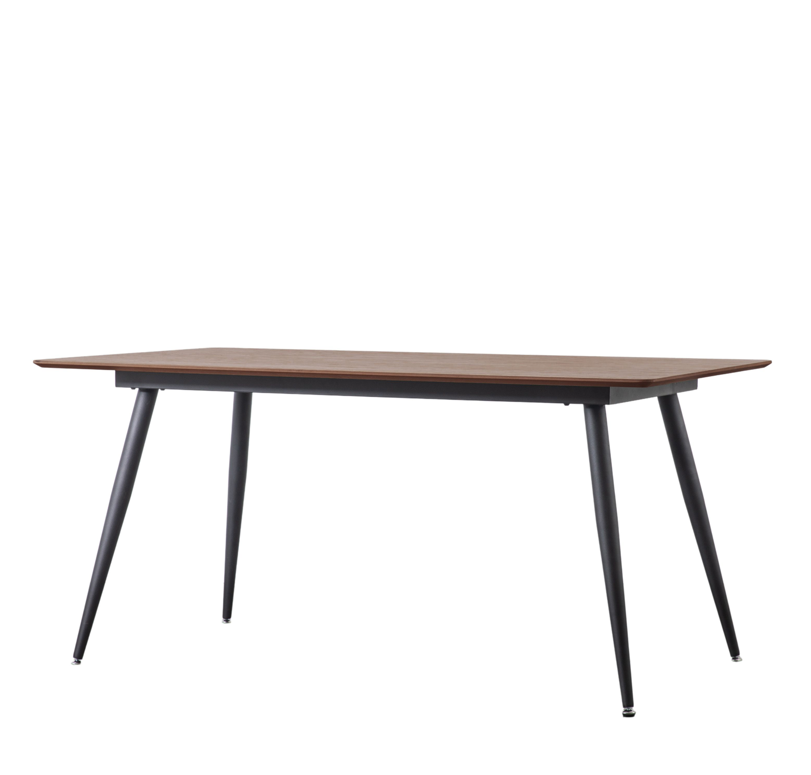 This stunning dining table brings a sleek and contemporary look to any space. The walnut veneer top adds warmth and richness, beautifully complemented by elegant black metal legs and refined chrome feet for a polished finish. Designed with practicality in mind, it is part of the Packed Flat Design Project, allowing for easy delivery to any room while reducing packaging. Assembly is required, with all tools supplied for convenience.