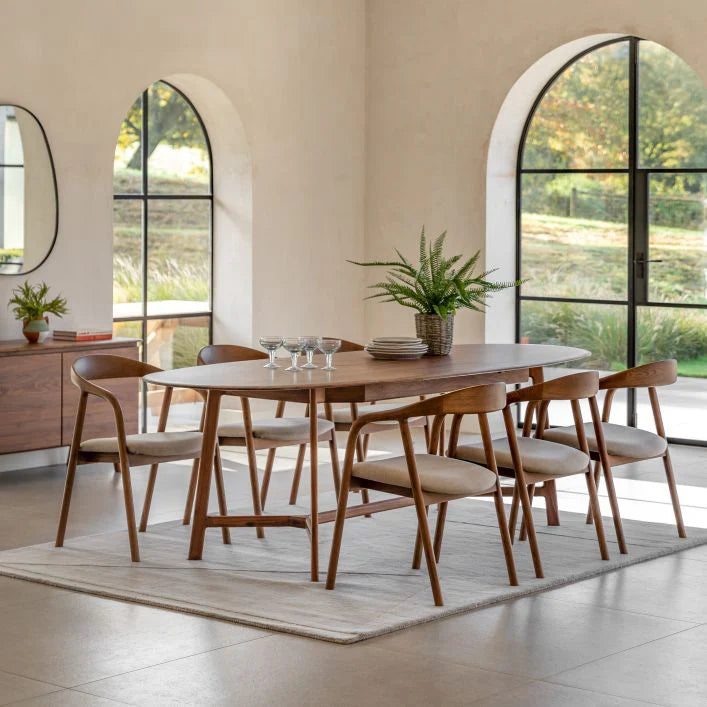 Add sophistication and functionality to your dining space with our Mawes Extending Dining Table. Its oval shape exudes modern elegance and can easily extend to welcome extra guests. The sleek, tapered legs provide a touch of Scandinavian minimalism, while the natural wood finish complements any interior.