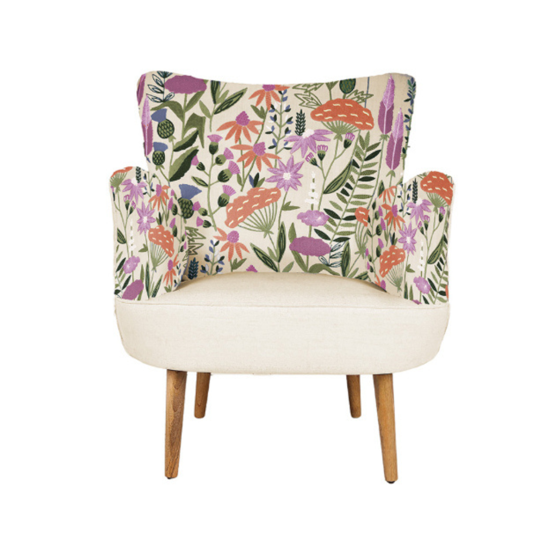This distinguished armchair showcases exquisite hand-embroidered wildflower detailing rendered in a sophisticated autumn palette of coral and lavender. The ergonomic design features a deep, supportive seat and generously proportioned armrests, delivering both comfort and elegance.