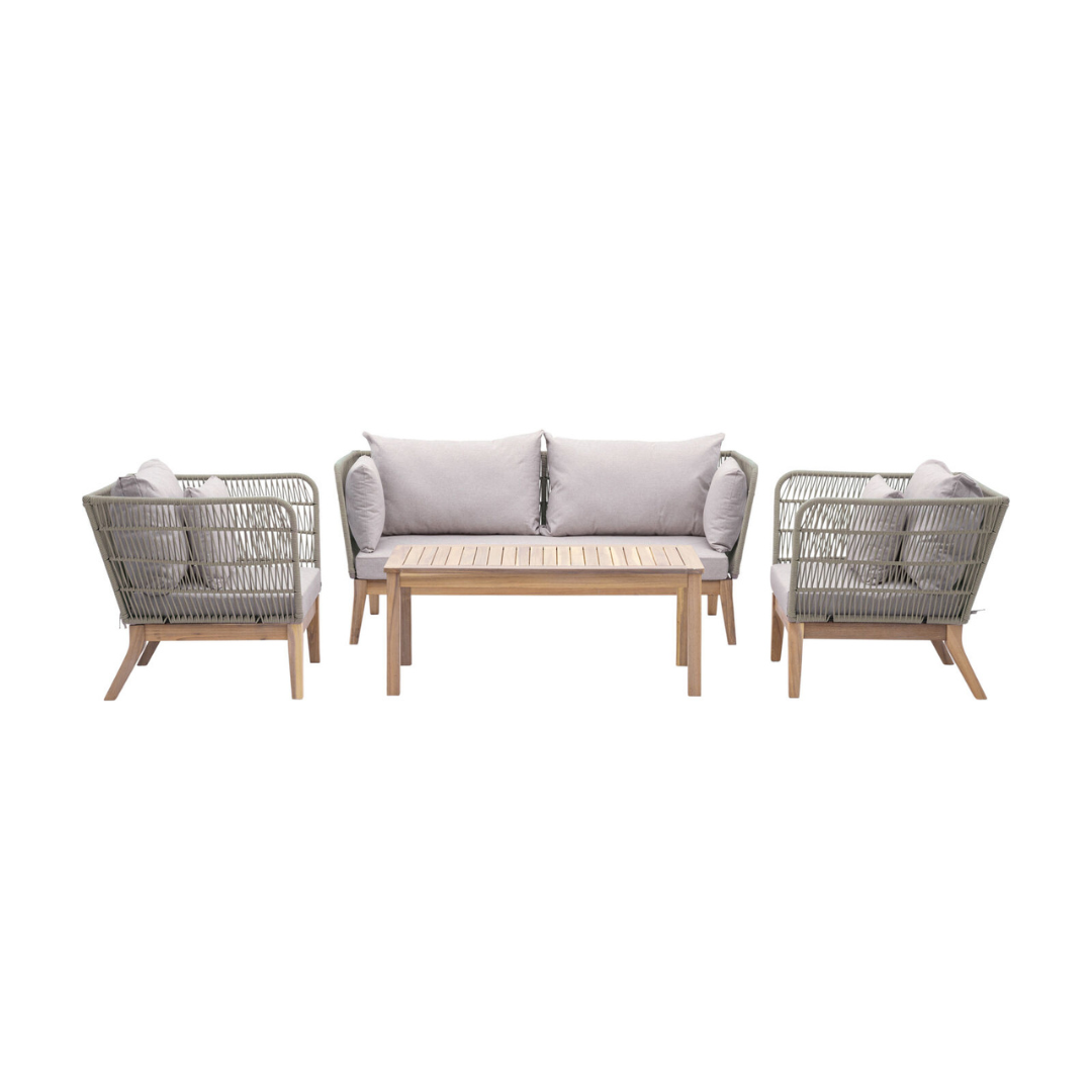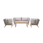 Transform your outdoor area with this luxurious and sophisticated lounge set. Including two armchairs and a two-seater sofa adorned with elegant woven rope detailing on the arms and seat backs in a chic grey colour. Complete with a sleek slatted top coffee table, all crafted with FSC Acacia wood and accompanied by UKFR foam cushions for added opulence.