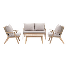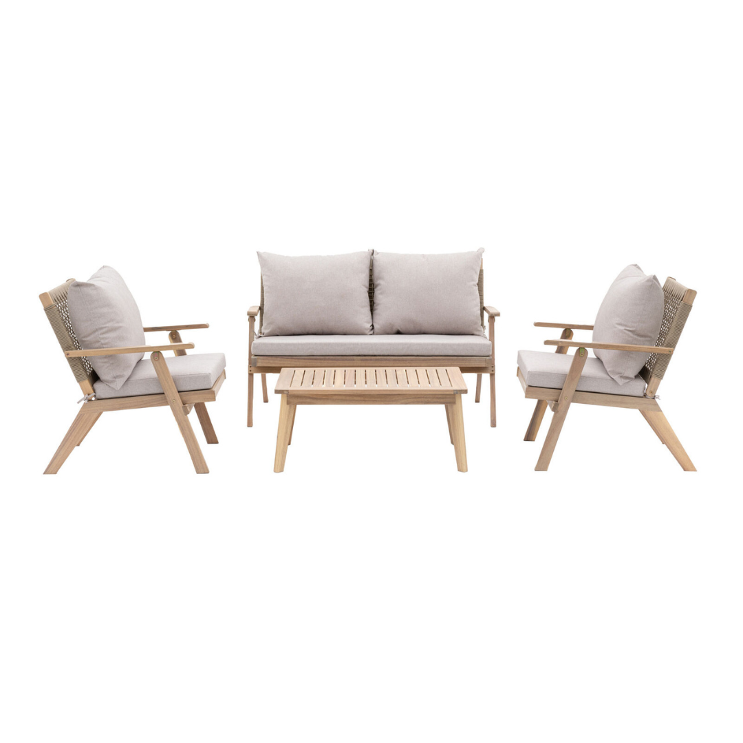 Enhance your outdoor area with this chic seating set. The two-seater couch and two armchairs feature intricate woven rope backs and plush grey cushions, accompanied by a sleek coffee table with a slatted top. Crafted from high-quality FSC Acacia wood with a stunning finish, this set is designed for effortless storage. Simply fold the armchairs and sofa flat after removing the cushions.