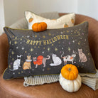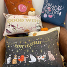 The Halloween Pawty Cushion features a printed design of costumed cats on a soft velvet base, finished with gold embroidery and a durable piped trim. A bold seasonal piece, ideal for adding character to your autumn décor.