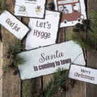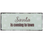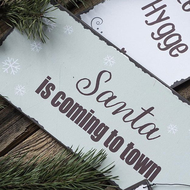 Tin-sign by Ib Laursen titled “Santa is coming to town”. Vintage-style white metal sign with red lettering and snowflake motif. Size: 30.5 cm × 13 cm.