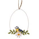 Hanging Easter decoration featuring a blue tit within an egg-shaped frame with floral and foliage detailing. Designed for spring and Easter displays.
