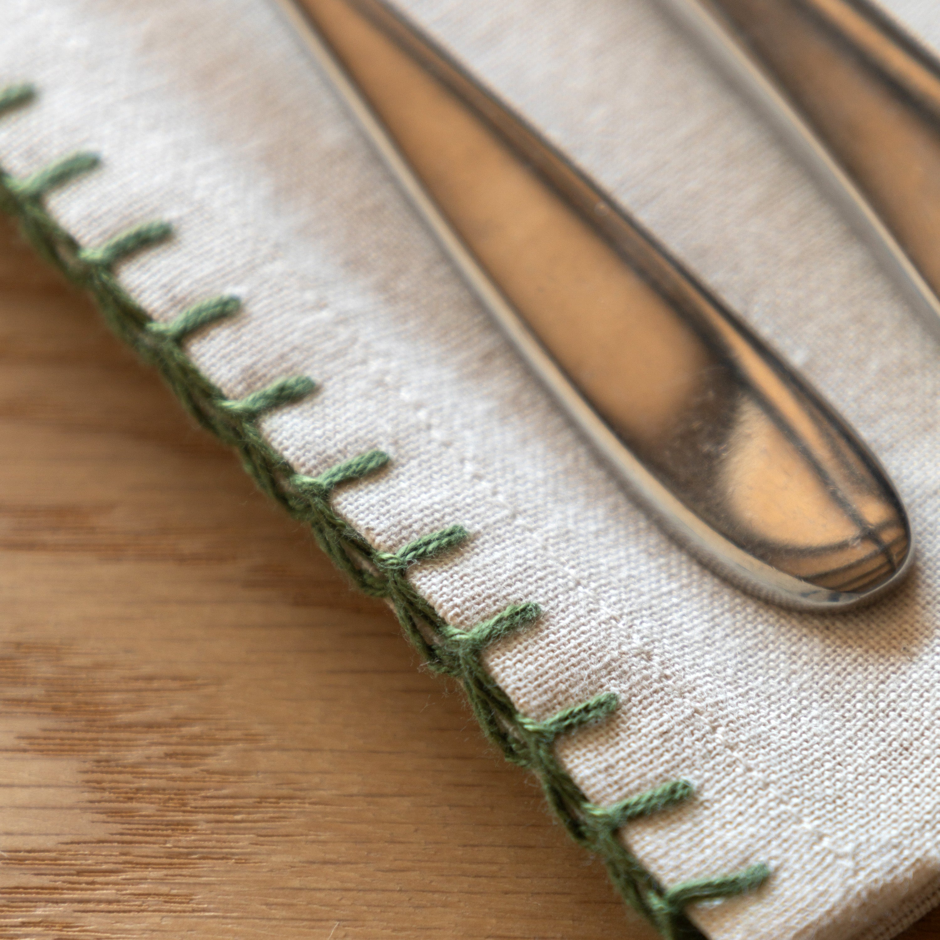 Embroidered with a classic mistletoe motif, these napkins bring a refined seasonal touch to your Christmas table setting. Each napkin is finished with a contrasting green blanket stitch around the edge, adding a hand-crafted feel.