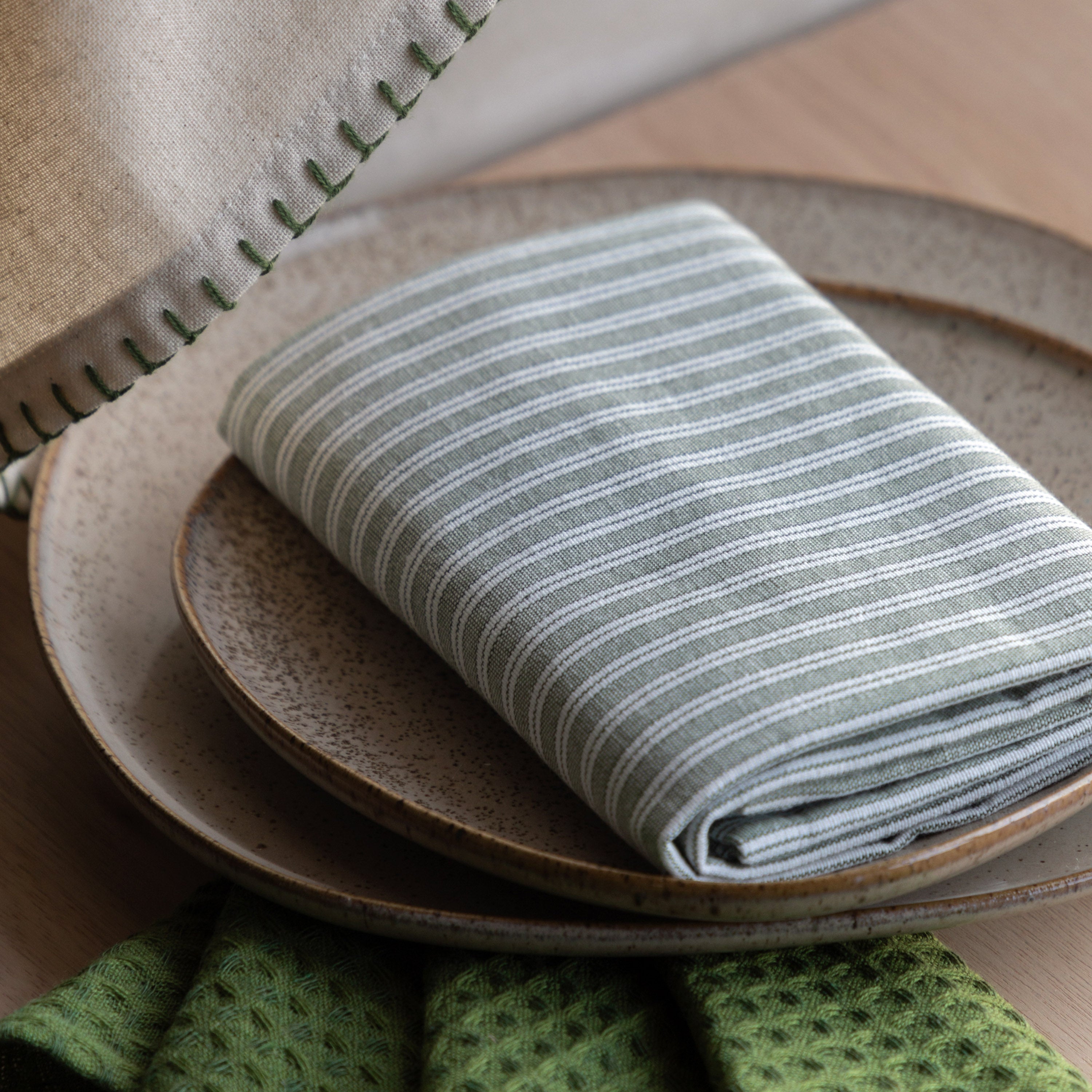 Bring a traditional festive touch to your kitchen with this set of three tea towels. The set includes a natural cotton towel embroidered with mistletoe tied with a red bow, a green waffle-textured towel and a green-and-white striped towel. The decorative stitching on the mistletoe towel adds a handcrafted feel, while the complementary green tones tie the set together beautifully. Ideal for adding a seasonal accent while keeping your kitchen practical and stylish.