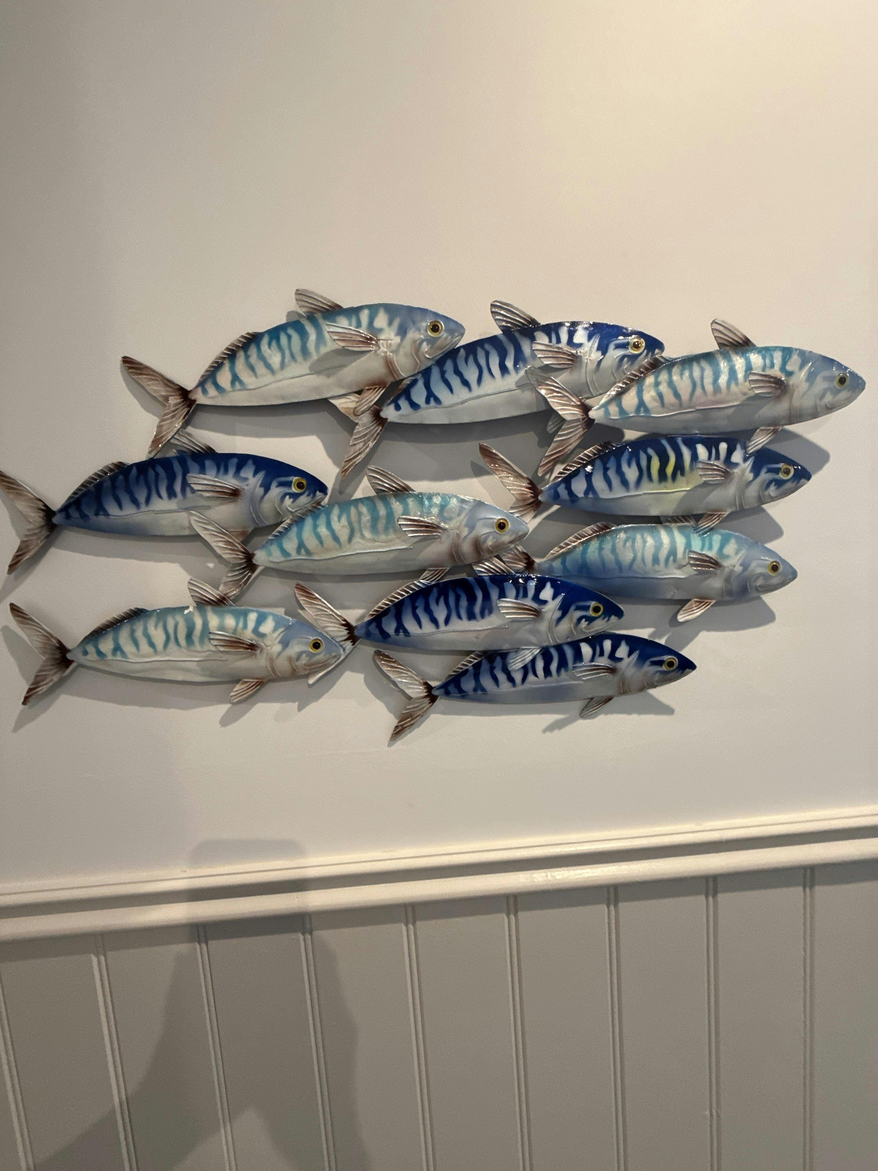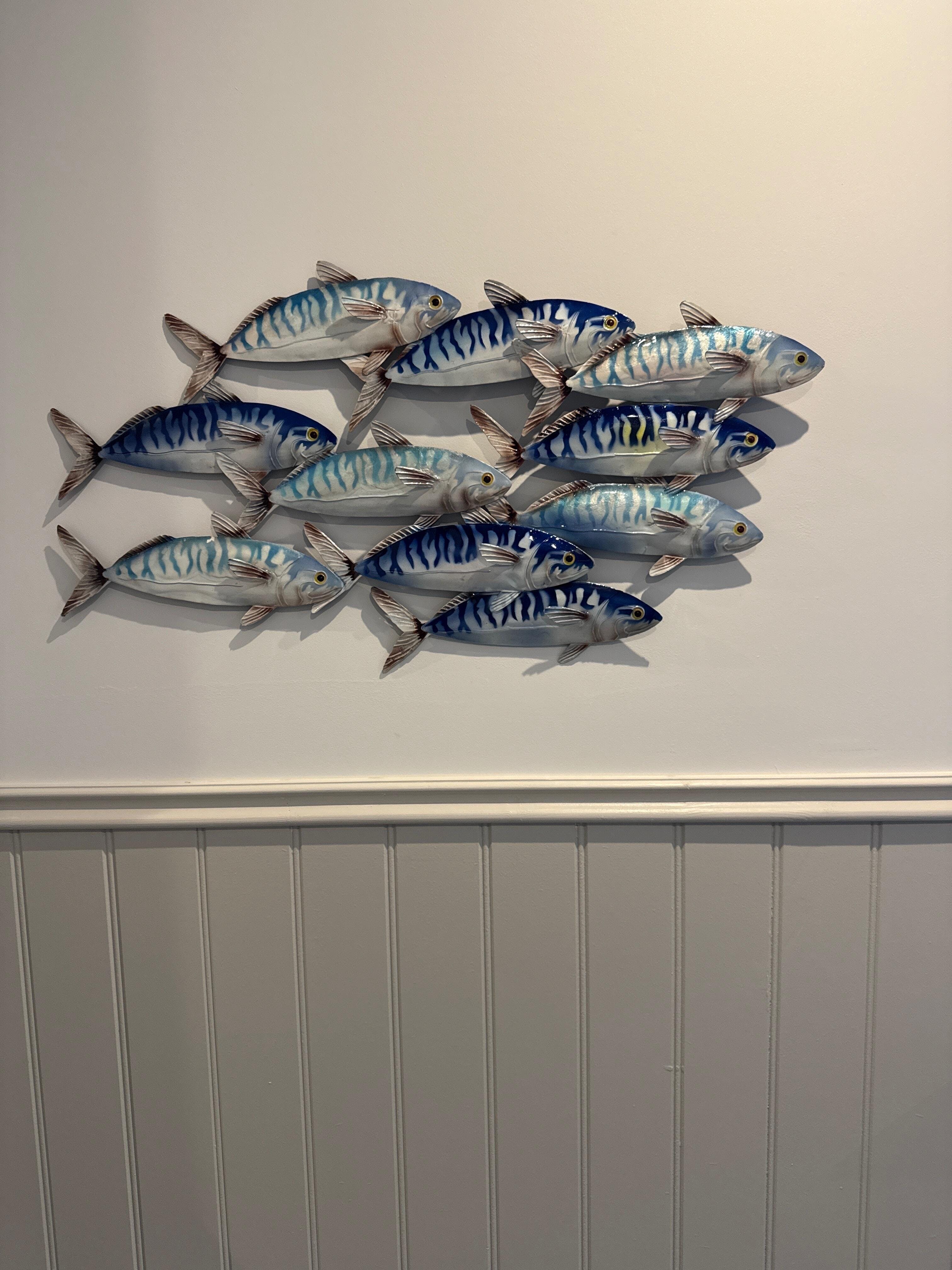 Add some playful ocean vibes to your space with our School of Mackerel Wall Art. This unique piece features a group of mackerel fish swimming in unison, symbolising unity and harmony. Handcrafted with care, it's perfect for anyone who loves quirky and fun home decor.