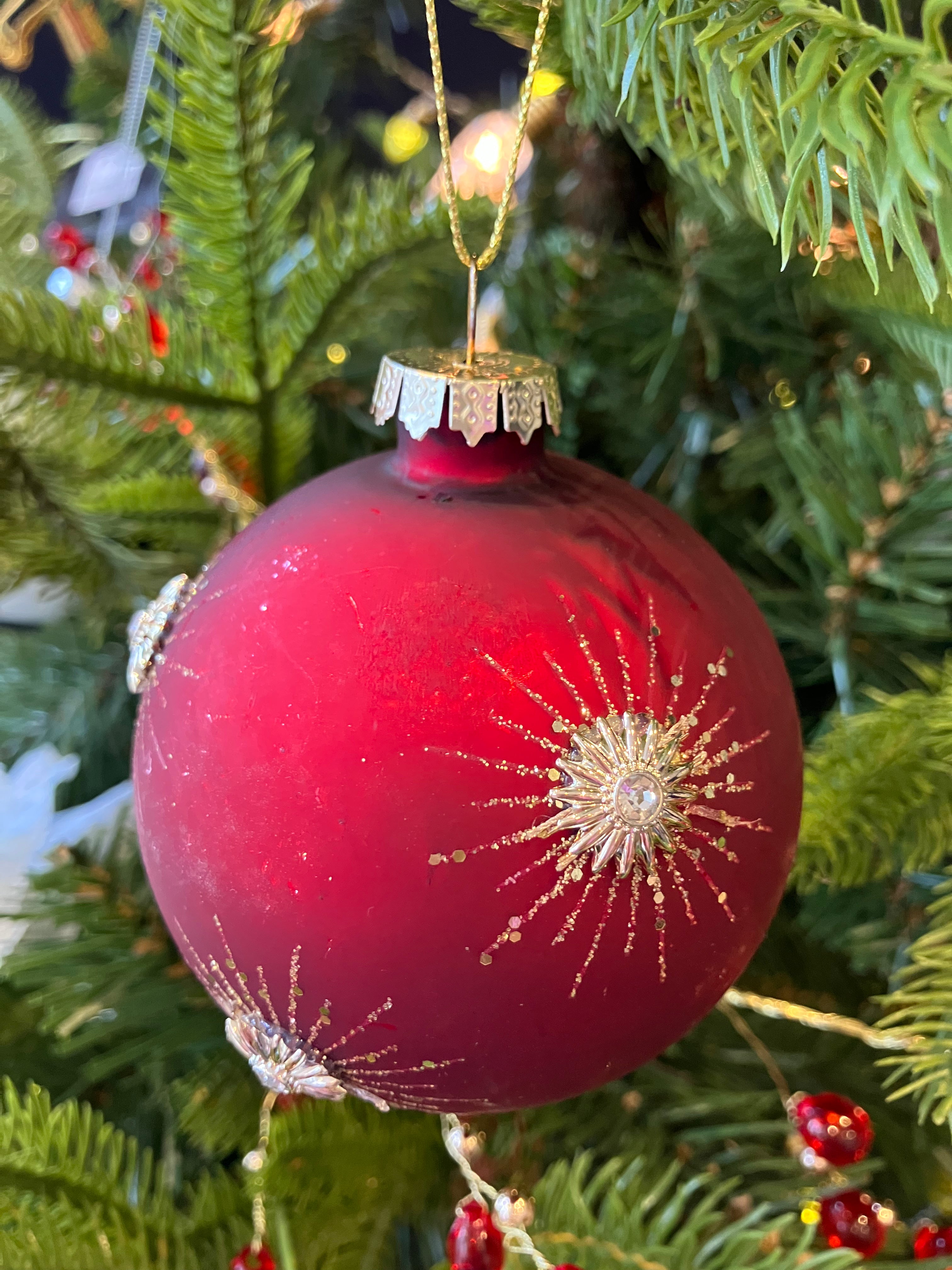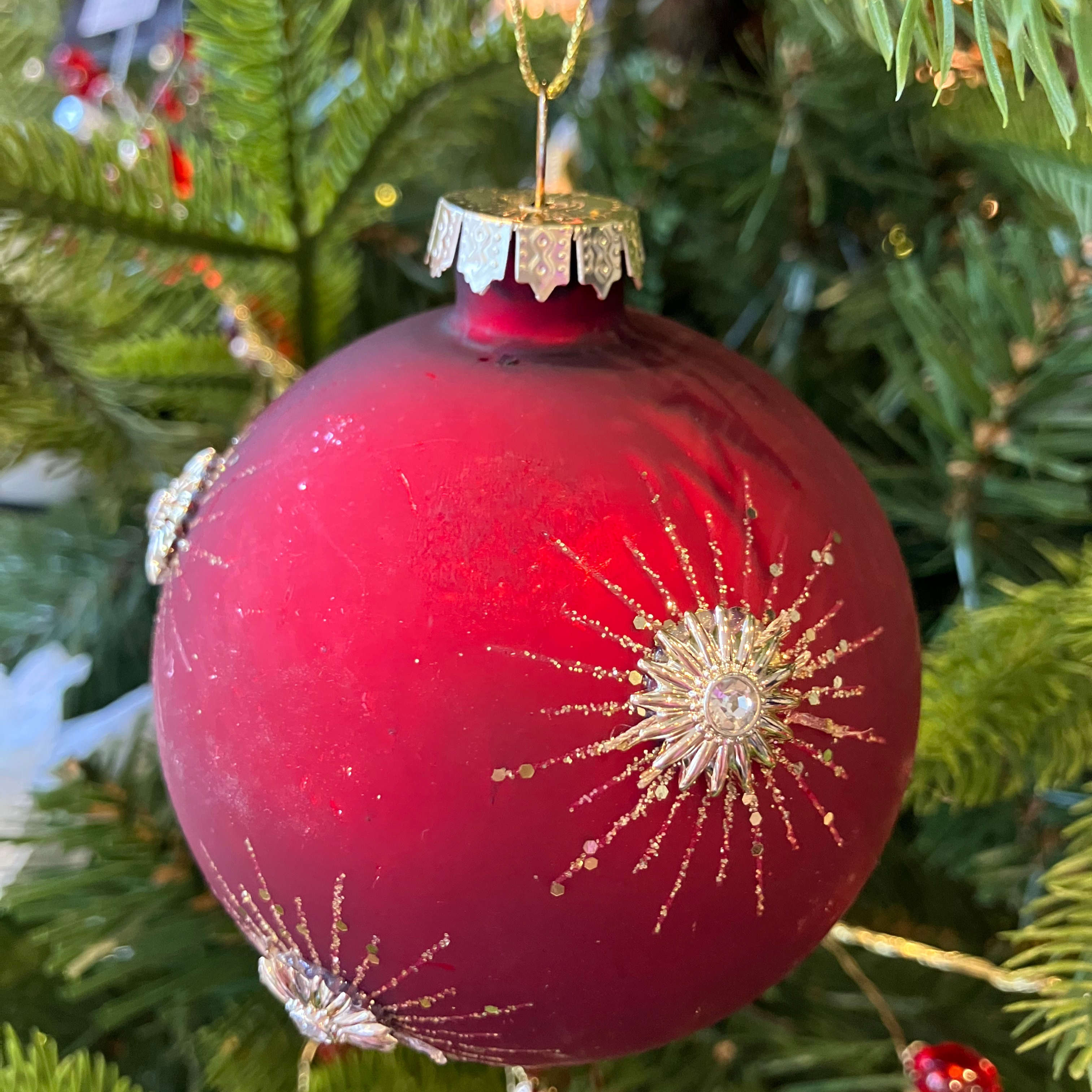 This festive ornament combines classic, seasonal style with modern detail. The red and gold design is complemented with the intricate snowflake decoration that adds texture and character, perfect for the winter holidays.