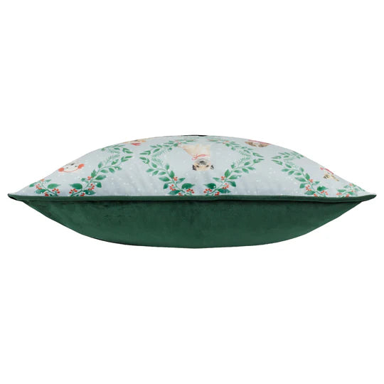 The Christmas Dog Friends Printed Velvet Cushion measures 43 cm square and is crafted from 100% polyester velvet for a soft, luxurious feel. It features a discreet zip closure for easy care and is machine washable up to 40°C. Designed for durability, this cushion can be cool ironed and line dried. Weighting only 0.18 kg, it adds festive charm with its unique dog-themed print while offering practical care instructions to maintain its vibrant appearance. This cushion is ideal for enhancing seasonal décor with expert quality and convenience.