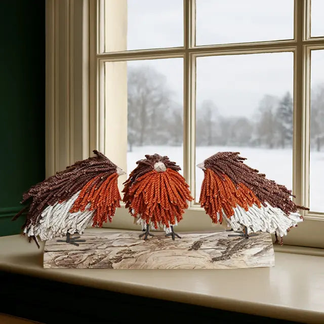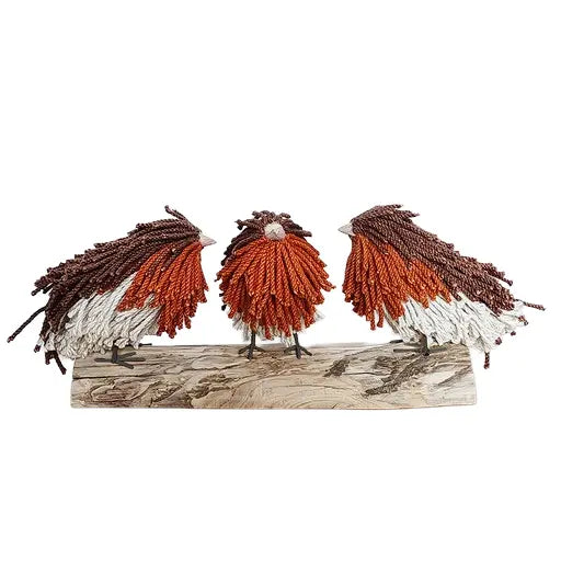 Decorative bird ornament featuring three Rory birds with a textured yarn finish, mounted on a single wooden base. Designed for shelf, console or windowsill display.